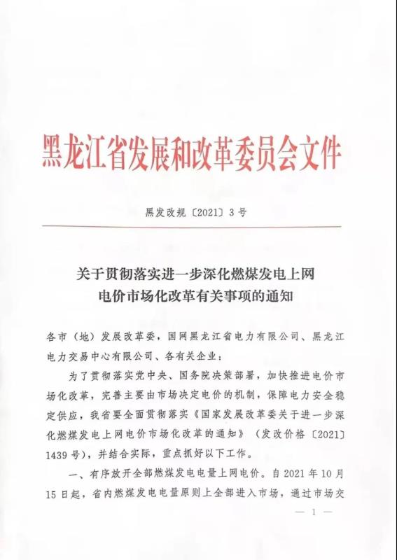 黑龍江:關(guān)于貫徹落實進一步深化燃煤發(fā)電上網(wǎng)電價市場化改革有關(guān)事項的通知