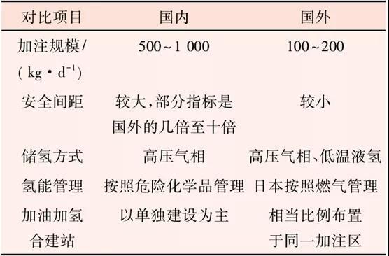 表1綜合對比歐洲、美國、日本等國家和地區(qū)的加氫站工藝技術(shù),現(xiàn)階段我國加氫站與國外加氫站存在一些顯著差異。