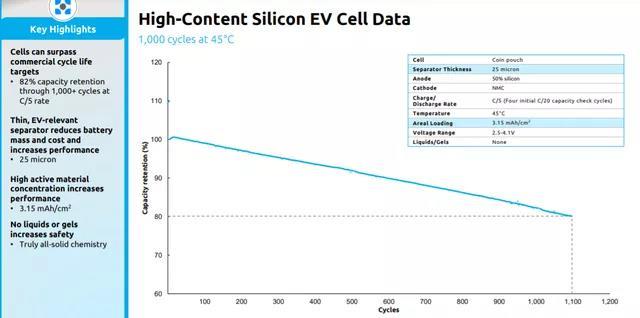 20層的小軟包電池在45°下的循環(huán)次數(shù)(C/5)超過 1,000 次循環(huán)( 80% 容量保持率),從數(shù)據(jù)來看,這個(gè)比QS的進(jìn)度要更好一些。
