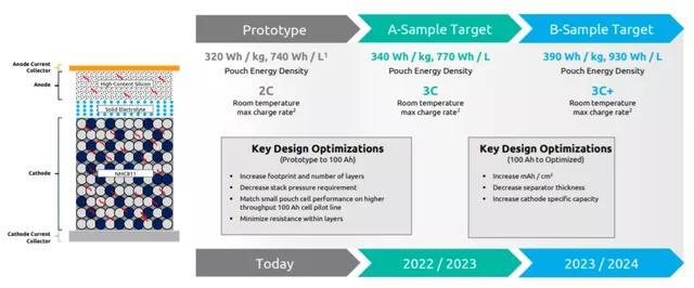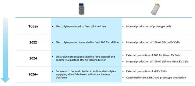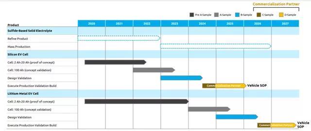 目前Solid Power的產(chǎn)品,從2Ah到20Ah,在10月的分析師會議里面還加入了2022年100Ah的計(jì)劃。如果真的完成這個(gè)計(jì)劃的話,這顆電池可以在2022年做出一些樣品來,這些小批量可以給兩家車企進(jìn)行實(shí)驗(yàn)室測試,甚至可以裝幾臺車裝車測試了。