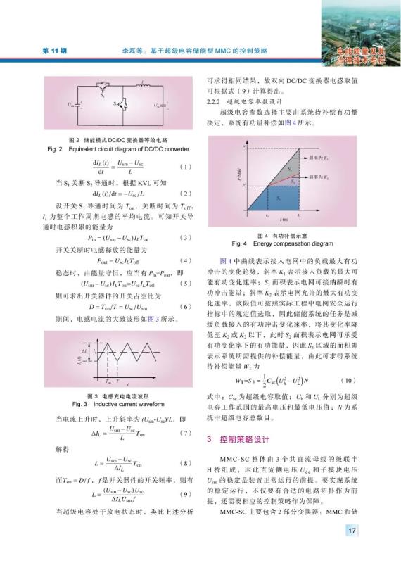 摘要:新能源并網(wǎng)以及沖擊性負(fù)荷接入易引發(fā)電網(wǎng)功率波動(dòng),會(huì)對(duì)鄰近發(fā)電機(jī)組及電力系統(tǒng)的安全穩(wěn)定構(gòu)成威脅,為此提出一種基于超級(jí)電容器儲(chǔ)能型模塊化多電平變換器(modular multilevel converter, MMC)的分布式儲(chǔ)能系統(tǒng),利用雙向DC/DC變換器控制儲(chǔ)能系統(tǒng)的充放電過程,并給出相應(yīng)參數(shù)設(shè)計(jì)原則。采用了基于雙閉環(huán)PI調(diào)節(jié)和移相PWM調(diào)制技術(shù)的控制策略,控制超級(jí)電容能量均衡和MMC級(jí)聯(lián)子模塊電容電壓穩(wěn)定,引入能量管理機(jī)制控制MMC和DC/DC變換器的協(xié)同運(yùn)行,實(shí)現(xiàn)了對(duì)中、高壓系統(tǒng)中沖擊性有功變化率的實(shí)時(shí)補(bǔ)償。搭建了Matlab/Simulink模型,仿真結(jié)果驗(yàn)證了該裝置及控制策略的有效性。