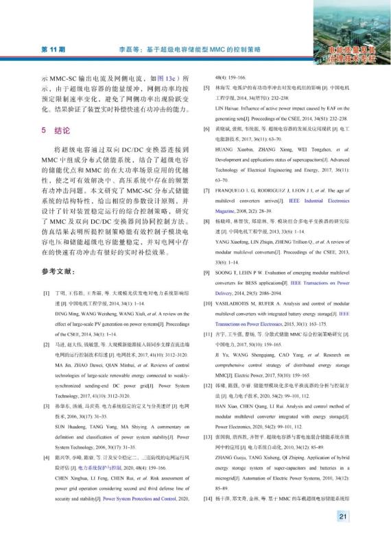 結(jié)論:將超級(jí)電容通過雙向DC/DC變換器連接到MMC中組成分布式儲(chǔ)能系統(tǒng),結(jié)合了超級(jí)電容的儲(chǔ)能優(yōu)點(diǎn)和MMC的在大功率場景應(yīng)用的優(yōu)越性,使之可有效解決中、高壓系統(tǒng)中存在的頻繁有功沖擊問題。本文研究了MMC-SC分布式儲(chǔ)能系統(tǒng)的結(jié)構(gòu)特性,給出相應(yīng)的參數(shù)設(shè)計(jì)原則,并設(shè)計(jì)了針對(duì)裝置穩(wěn)定運(yùn)行的綜合控制策略,研究了MMC及雙向DC/DC變換器間協(xié)同控制方法。仿真結(jié)果表明所提控制策略能有效控制子模塊電容電壓和儲(chǔ)能超級(jí)電容能量穩(wěn)定,并對(duì)電網(wǎng)中存在的快速有功沖擊有很好的實(shí)時(shí)補(bǔ)償效果。