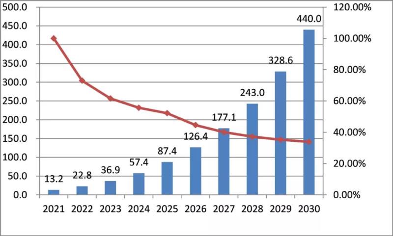 不論是電網(wǎng)保供電還是新能源消納,電力系統(tǒng)都更加需要大規(guī)模、長周期、易調(diào)度的新型儲能電站,以實現(xiàn)日內(nèi)充分調(diào)節(jié)以及特殊情況下跨日、跨月調(diào)節(jié),僅從日內(nèi)調(diào)節(jié)來說,參照抽水蓄能,一般配置4小時以上的調(diào)節(jié)能力,那么新型儲能的調(diào)節(jié)能力也至少達(dá)到4小時以上?!蛾P(guān)于鼓勵可再生能源發(fā)電企業(yè)自建或購買調(diào)峰能力增加并網(wǎng)規(guī)模的通知》(發(fā)改運行〔2021〕1138號)中,也提出了配置4小時左右的指引,較長時長儲能將是未來的發(fā)展方向。考慮新型儲能配置逐步從當(dāng)前比較普遍的2小時上升至4小時,預(yù)計2030年新型儲能總?cè)萘繉⒊^440GWh以上。新型儲能總?cè)萘看笾纶厔萑鐖D1,紅色曲線為總?cè)萘吭鏊??!笆奈濉逼陂g總?cè)萘坑?0倍以上增長空間,“十五五”期間總?cè)萘咳源嬖?倍以上增長空間。
