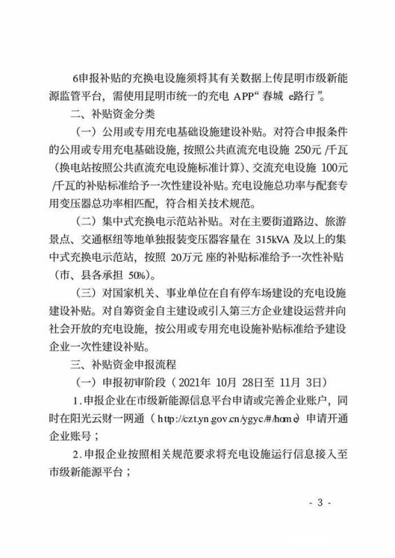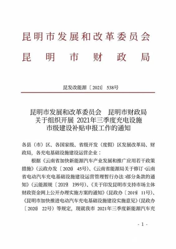 近日,昆明市發(fā)展和改革委員會、昆明市財政局發(fā)布《關(guān)于組織開展2021年三季度充電設(shè)施市級建設(shè)補貼申報工作的通知》(以下簡稱“通知”)。通知指出,昆明市2021年三季度新能源汽車充電設(shè)施市級建設(shè)補貼申報對象為:1.在昆明市發(fā)展和改革委員會進(jìn)行過充電基礎(chǔ)設(shè)施建設(shè)運營登記的企業(yè);2.其他符合申報充電基礎(chǔ)設(shè)施獎勵和補貼條件的單位或企業(yè)。