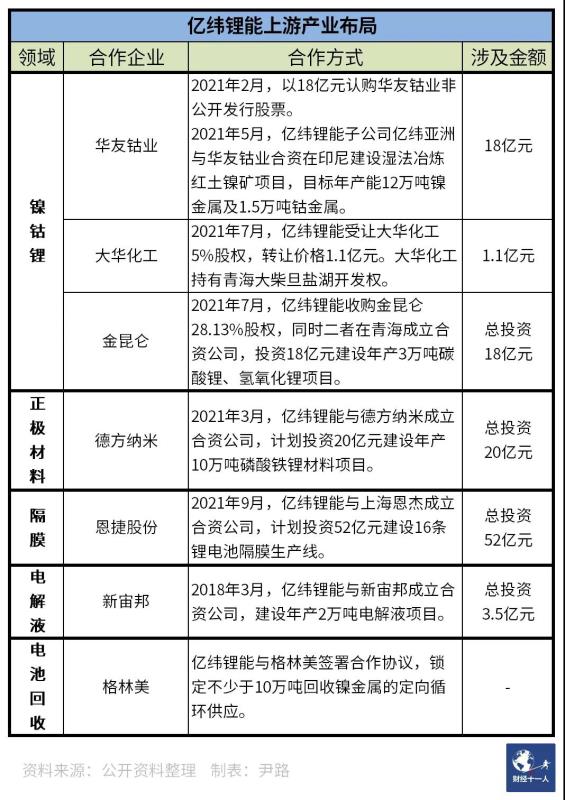億緯鋰能與寧德時(shí)代類似,在礦產(chǎn)領(lǐng)域,通過(guò)入股增強(qiáng)自己對(duì)上游資源的影響力,而在其他領(lǐng)域,則主要通過(guò)與頭部企業(yè)聯(lián)合投資擴(kuò)產(chǎn)的方式,鎖定產(chǎn)能,并對(duì)沖價(jià)格影響。