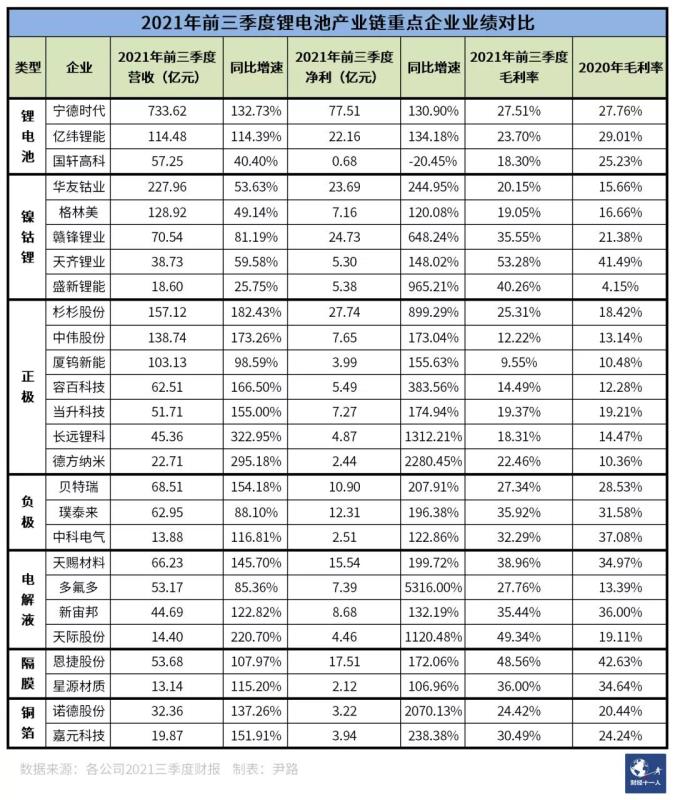 10月底,上市公司紛紛發(fā)布第三季度財(cái)報(bào),《財(cái)經(jīng)十一人》按照電池企業(yè)、鎳鈷鋰礦產(chǎn)企業(yè)、正極、負(fù)極、電解液、隔膜、銅箔的分類梳理了產(chǎn)業(yè)鏈重點(diǎn)企業(yè)的業(yè)績(jī)表現(xiàn),見(jiàn)下表。