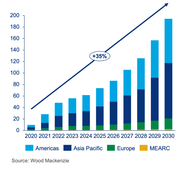 圖表:全球儲能部署容量預(yù)測,2021-2030年
