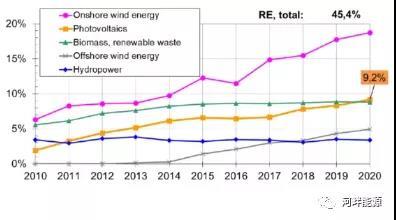 近年,德國可再生能源發(fā)電保持增長勢頭,風(fēng)電和光伏發(fā)電成為電能清潔替代主力,有力推動了德國能源轉(zhuǎn)型與可再生能源發(fā)展。圖1給出了從2010-2020年德國可再生能源發(fā)電量在電能消費中的占比變化。2020年可再生能源發(fā)電量在德國電能消費占比達到45.4%,達到歷史最高水平。