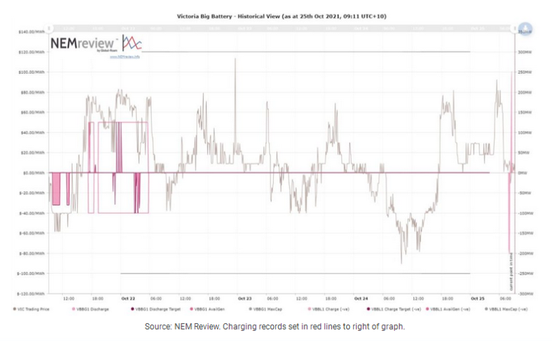 如下圖所示(由NEM Review的Paul McArdle提供),該儲能項(xiàng)目在早上8點(diǎn)之后以205MW的裝機(jī)容量進(jìn)行充電,然后在短時(shí)間內(nèi)以250MW的裝機(jī)容量放電,從而深入了解其對當(dāng)?shù)仉娋W(wǎng)和批發(fā)市場的潛在影響。