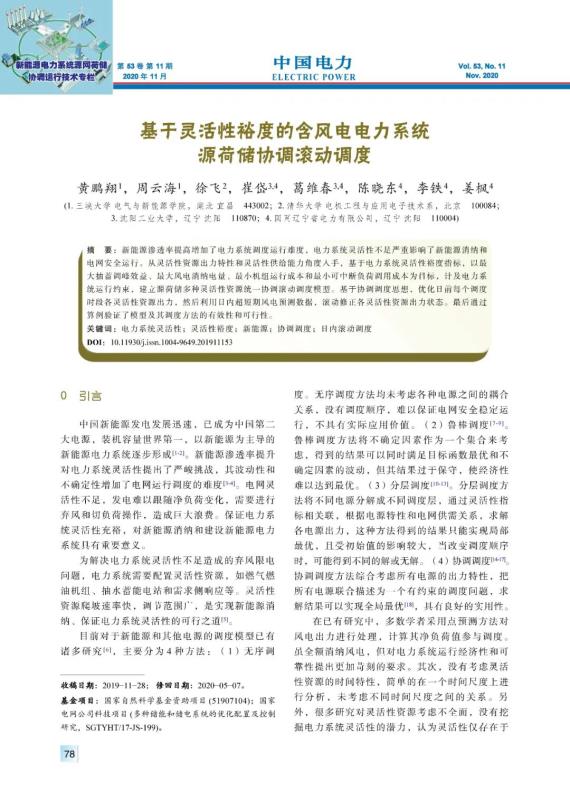 黃鵬翔, 周云海, 徐飛, 等. 基于靈活性裕度的含風(fēng)電電力系統(tǒng)源荷儲協(xié)調(diào)滾動調(diào)度[J]. 中國電力, 2020, 53(11): 78-88.