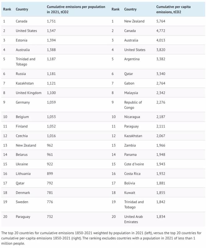 Carbon Brief以兩種不同的方式探討了相對(duì)人口規(guī)模的計(jì)算問(wèn)題,這些方法給出了明顯不同的結(jié)果,突出了解釋累積人均排放量的挑戰(zhàn)。第一種方法是將一個(gè)國(guó)家每年的累積排放量除以該國(guó)當(dāng)時(shí)的人口數(shù)量,隱含地將過(guò)去的責(zé)任分配給今天活著的人。左下表顯示了截至2021年在此基礎(chǔ)上排名前20的國(guó)家。第二種方法是將一個(gè)國(guó)家每年的人均排放量加起來(lái),得出截至2021年的結(jié)果(如右下表所示),這使得過(guò)去和現(xiàn)在的人口人均排放量具有同等的重要性。