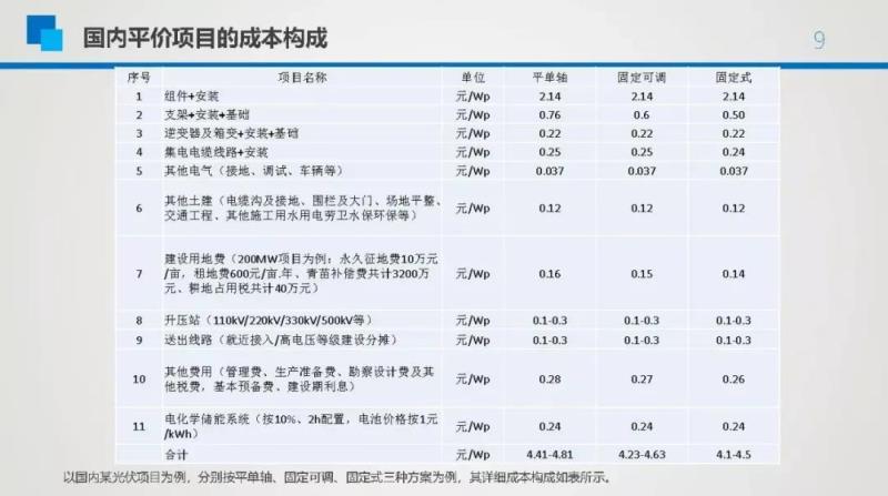 今年以來,隨著組件價格以及大宗商品持續(xù)上漲,導(dǎo)致光伏電站建設(shè)成本水漲船高。此前,在第六屆新能源電站設(shè)計、工程與設(shè)備選型研討會上,西北勘測設(shè)計研究院有限公司新能源工程院總工程師、規(guī)劃研究中心主任惠星測算,在當前的價格水平下,國內(nèi)平價光伏項目(含儲能),以固定支架計算其項目成本大致落在4.1~4.5元/瓦左右,即使不含升壓站、儲能、土地建設(shè)等費用,其價格仍將達到3.3~3.7元/瓦。