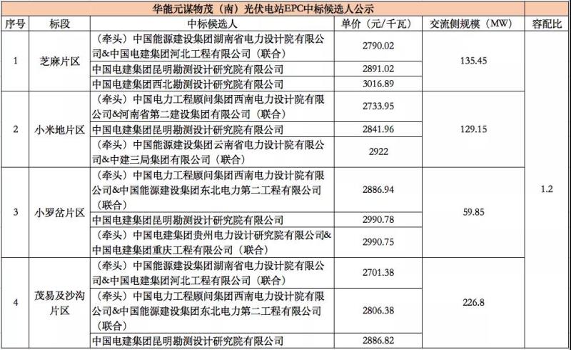 11月1日,華能元謀物茂(南)光伏電站(550MW復(fù)合型光伏項目)EPC中標結(jié)果公示。從評標價格來看,報價穩(wěn)定在2.7~3元/瓦,最低中標價為2701.38元/千瓦,即2.7元/瓦。