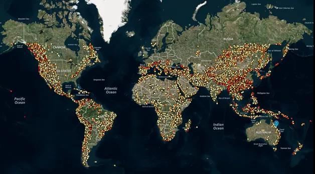 圖5 南緯56度到北緯60度之間適合抽水儲(chǔ)能的地點(diǎn)。