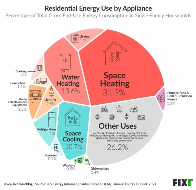 美國能源信息署(EIA)的數(shù)據(jù),美國家庭中消耗能源最多的十大設(shè)備是:供暖、熱水器、空調(diào)制冷、冰箱、干衣機、照明、家庭娛樂設(shè)備、炊具、電腦和鍋爐吹風(fēng)機。