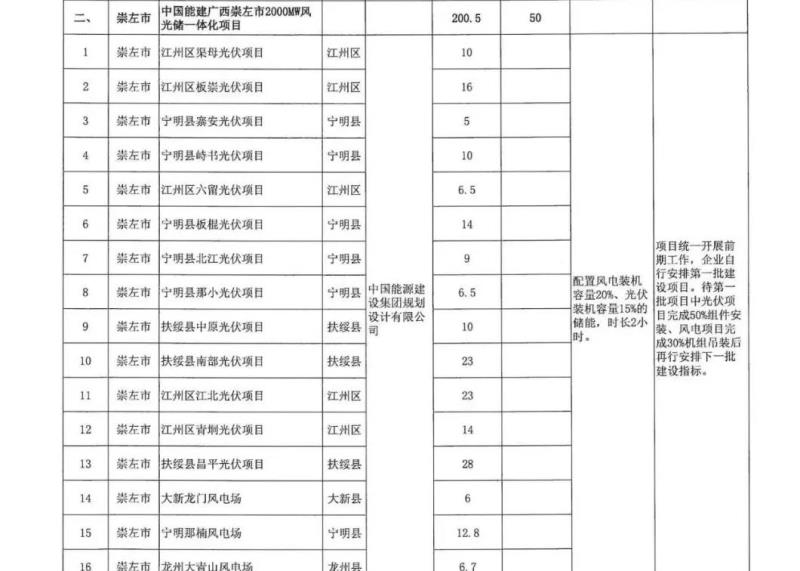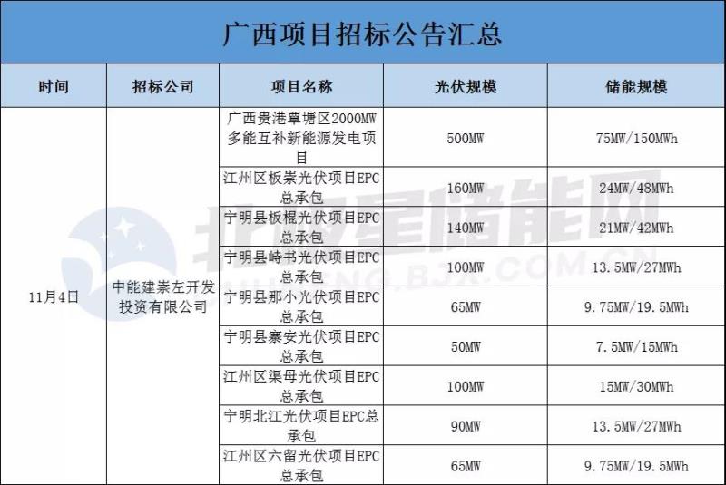 11月4日,中能建崇左開發(fā)投資有限公司連續(xù)發(fā)布9個招標(biāo)項(xiàng)目,儲能配置比例都為15%×2h,共配置儲能規(guī)模達(dá)189MW/378MWh。這9個項(xiàng)目分別是中國能建廣西貴港覃塘區(qū)2000MW多能互補(bǔ)新能源發(fā)電項(xiàng)目、江州區(qū)板崇光伏項(xiàng)目EPC總承包、寧明縣板棍光伏項(xiàng)目EPC總承包、寧明縣峙書光伏項(xiàng)目EPC總承包、寧明縣那小光伏項(xiàng)目EPC總承包、寧明縣寨安光伏項(xiàng)目EPC總承包、江州區(qū)渠母光伏項(xiàng)目EPC總承包、寧明北江光伏項(xiàng)目EPC總承包、江州區(qū)六留光伏項(xiàng)目EPC總承包。并且都位列于之前10月9日,廣西壯族自治區(qū)能源局印發(fā)《2021年市場化并網(wǎng)陸上風(fēng)電、光伏發(fā)電及多能互補(bǔ)一體化項(xiàng)目建設(shè)方案的通知》之中。