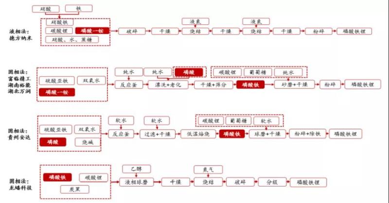 按LFP材料生產(chǎn)工藝主要有固相法+磷酸鐵、固相法+草酸亞鐵、液相法+硝酸亞鐵3種技術(shù)路線。固相法工藝簡單,產(chǎn)品克容量較高,但相比液相法物料混合不均勻,且較為依賴磷酸鐵產(chǎn)能,固相法+草酸亞鐵生產(chǎn)安全風(fēng)險高;液相法+硝酸亞鐵溶劑混合均勻,產(chǎn)品一致性高,且緩解前驅(qū)體供應(yīng)瓶頸,但生產(chǎn)管控難度較大。