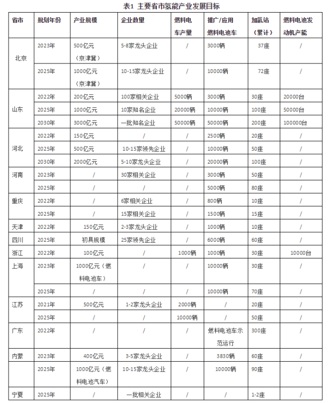 從主要省市的氫能產(chǎn)業(yè)發(fā)展規(guī)劃所制定的目標(biāo),可以清晰地看出,燃料電池汽車及其產(chǎn)業(yè)鏈?zhǔn)歉鞯匕l(fā)展氫能的主要,甚至是唯一選擇。表2中列舉的13個(gè)省市自治區(qū)中,除了寧夏以外,其余省市自治區(qū)的氫能產(chǎn)業(yè)規(guī)劃都具體化為氫燃料電池車汽車的生產(chǎn)或推廣目標(biāo),其中還有兩個(gè)?。ㄉ綎|和浙江)規(guī)劃了氫燃料電池發(fā)動(dòng)機(jī)產(chǎn)能目標(biāo)。對(duì)于氫能在其他領(lǐng)域的應(yīng)用則沒(méi)有涉及。