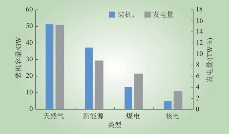 圖1 2020年美國電源裝機和發(fā)電量結構