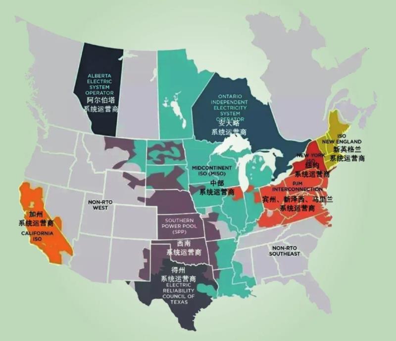 第二級是電力調度機構,負責各自區(qū)域的電力供需平衡,以保持電網穩(wěn)定。北美地區(qū)包括9家系統(tǒng)運營商(區(qū)域系統(tǒng)運營商(regional transmission organizations,RTO)、獨立系統(tǒng)運營商(independent system organizations,ISO)) [6],如圖3所示,除負責各自轄區(qū)內的電網調度和電力實時平衡外,還負責該區(qū)域內的市場運營。