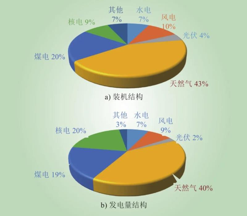 自2000年以來,隨著美國“頁巖氣革命”的成功,美國電網的電源結構逐漸從以燃煤發(fā)電為主向以天然氣發(fā)電為主過渡。截至2020年年底,美國天然氣發(fā)電裝機容量達到4.8億kW。2020年天然氣發(fā)電量達到1.6萬億kW·h。2020年美國電源裝機和發(fā)電量結構[1]如圖1所示。