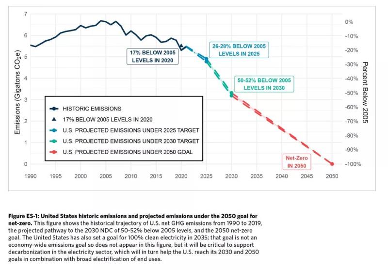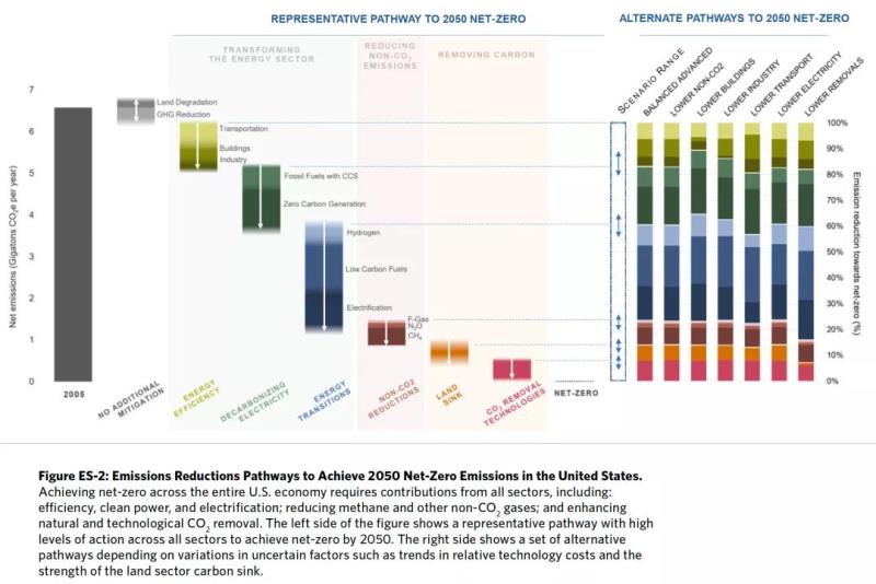 報(bào)告提出了美國2050年前實(shí)現(xiàn)凈零排放終極目標(biāo)的技術(shù)路線圖,闡明了2030美國國家自主貢獻(xiàn)目標(biāo)與2050凈零排放目標(biāo)之間的傳承關(guān)系,強(qiáng)調(diào)實(shí)現(xiàn)2030美國國家自主貢獻(xiàn)目標(biāo)將使美國堅(jiān)實(shí)地走在通往凈零排放道路之上。因?yàn)楸M管存在數(shù)條實(shí)現(xiàn)路徑,但所有路徑都要從完成美國2030國家自主貢獻(xiàn)目標(biāo)開始。