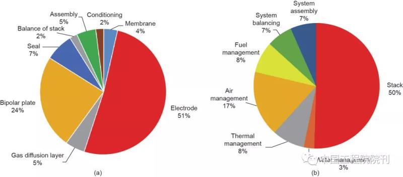 制造成本包括設計、材料、元件制造和裝配、工人勞動、設備資產,這些要素貫穿整個燃料電池的定制以及商業(yè)生產過程。Ahluwalia等在阿貢(Argonne)實驗室計了80 kWnet質子交換膜(PEM)燃料電池的配置體系(圖3)。Yang分析了這種80 kWnet阿貢(Argonne)燃料電池組體系的成本,并準確計算出該電池組的總成本為大約30 USD·kW?1。電池的電極(包括陰極和陽極)和催化劑占總成本的51%。電池組的裝配和調試大約占總成本的7%。因此,燃料電池組中成本最高的3個部分是電極、雙極板和電池密封圈[圖4(a)]。