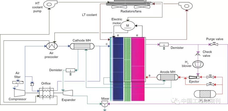 圖3 阿貢(Argonne)2009年質子交換膜燃料電池配置體系。HT:高溫;LT:低溫;MH:膜增濕器