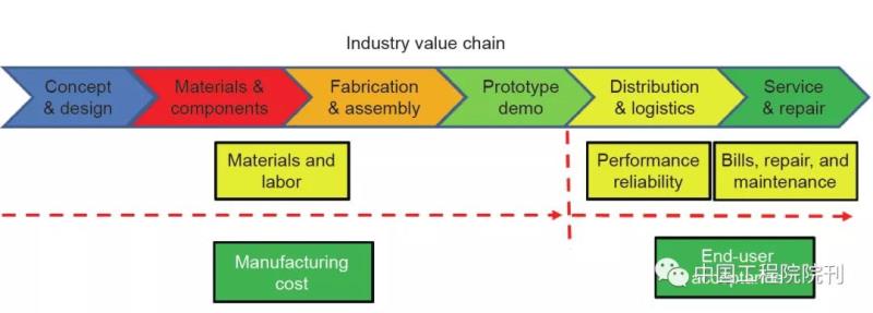 一項新的產品要先在實驗過程中達到經濟和技術上的目標,然后再根據合理設計的指標,在完善的體系內進行大規(guī)模生產。制造過程的生命周期和價值鏈代表了產品的生產過程和成本,如圖2所示。燃料電池組的技術經濟生命周期可分為兩個主要的階段:制造階段和最終用戶階段。