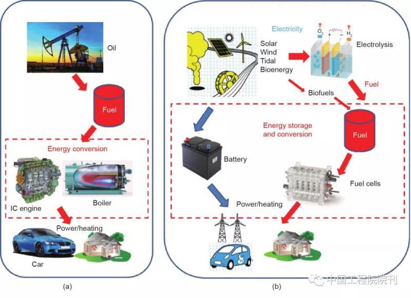 創(chuàng)造低碳技術和綠色產業(yè),開發(fā)可再生能源是關鍵。一般而言,風能、太陽能和潮汐能是可再生能源商業(yè)鏈中發(fā)電的主要來源[圖1(b)]??窟@些途徑產生的電可用于汽車或者住房供暖。然而,可再生能源通常需要依賴季節(jié)、氣候或地理條件,其時空分布也不均勻。可再生能源的這種異質性需要能源儲存和有效的能源供應分布智能網絡。然而大規(guī)模的電力儲存長久以來都是一大挑戰(zhàn)。目前已經開發(fā)了許多技術來解決儲能的問題,如抽水蓄能電廠、相變材料、充電電池以及燃料電池。如果將可再生能源作為一種可行的替代能源,就需要大規(guī)模儲存電能,與燃料電池相關的電池技術和電解燃料是大規(guī)模儲存電能的兩種最佳方法(圖1)。
