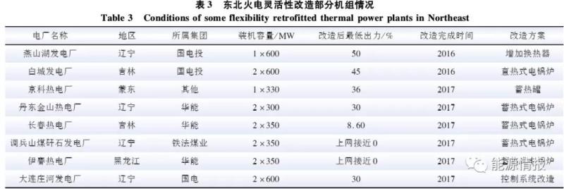 為了充分挖掘火電機(jī)組調(diào)峰潛力,提高系統(tǒng)可再生能源消納能力,國家能源局于2016年下發(fā)《關(guān)于火電靈活性改造試點(diǎn)項(xiàng)目通知》,安排“三北”地區(qū)21個(gè)試點(diǎn)項(xiàng)目,合計(jì)改造規(guī)模1635萬kW。通過靈活性改造,使熱電機(jī)組增加20%額定容量的調(diào)峰能力,最小技術(shù)出力達(dá)到40%~50%額定容量,純凝機(jī)組增加15%~20%額定容量的調(diào)峰能力,最小技術(shù)出力達(dá)到30%~35%額定容量,部分具備改造條件的電廠預(yù)期達(dá)到國際先進(jìn)水平,機(jī)組不投油穩(wěn)燃時(shí)純凝工況最小技術(shù)出力達(dá)到20%~25%?!峨娏Πl(fā)展“十三五”規(guī)劃》 中明確指出,“十三五”期間,“三北”地區(qū)熱電機(jī)組靈活性改造約1.33億kW,純凝機(jī)組改造約8200萬kW;其他地方純凝改造約450萬kW。改造后,增加調(diào)峰能力4600萬kW,其中,“三北”地區(qū)增加4500萬kW。這些措施已作為提升電力系統(tǒng)調(diào)節(jié)能力的核心組成部分。部分東北火電靈活性改造機(jī)組情況如表3所示。