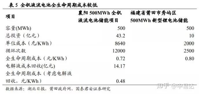 由于全釩液流電池的壽命長,充放電次數(shù)多,釩電池全生命周期成本較低,釩電池成本優(yōu)勢明顯。下面以襄陽500MWh全釩液流電池儲能項(xiàng)目與福建省莆田市500MWh鋰電池儲能項(xiàng)目作為對比,不考慮電解液的回收,全釩液流電池全生命周期成本在0.72元/kwh,而鋰電池全生命周期成本在0.8元/kwh;若考慮電解液的回收,假設(shè)電解液成本占比41%且能夠80%回收,則釩電池的全生命周期成本為0.48元。隨著釩電池技術(shù)的進(jìn)步及規(guī)?;a(chǎn),我們認(rèn)為釩電池電堆成本將持續(xù)下降,未來釩電池將會成本儲能的最佳選擇,推動儲能達(dá)到經(jīng)濟(jì)性。