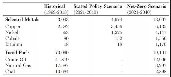 表1:2021-2040年某些能源轉(zhuǎn)型金屬全球生產(chǎn)的累計實際收入(十億美元)