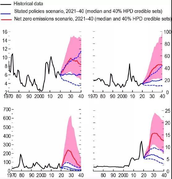 價格在2030年左右達到頂峰有兩個原因。首先,在零排放情景下,需求的急劇上升是前置的。與基于化石燃料的能源生產(chǎn)不同,可再生能源生產(chǎn)首先使用金屬—例如,建造風(fēng)力渦輪機。其次,價格暴漲引發(fā)了供給增加,降低了2030年后的市場緊張程度。