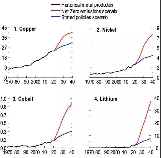 圖1:金屬產(chǎn)量和IEA能源轉(zhuǎn)型情景(百萬公噸)