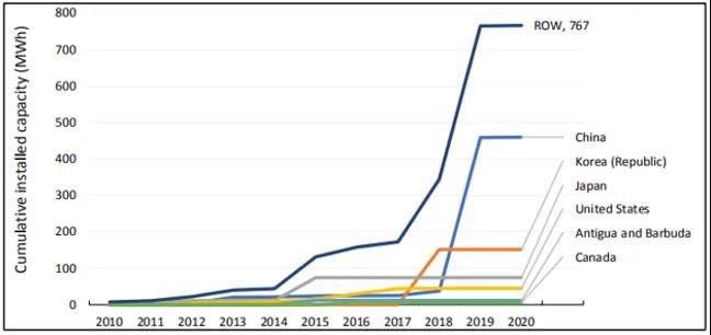 2010-2020年全球液流電池裝機(jī)量增長情況(MWh)