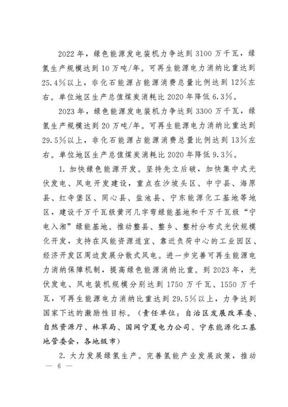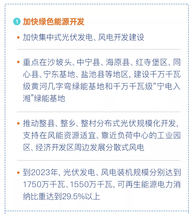 1、加快綠色能源開(kāi)發(fā)。堅(jiān)持先立后破,加快集中式光伏發(fā)電、風(fēng)電開(kāi)發(fā)建設(shè),重點(diǎn)在沙坡頭區(qū)、中寧縣、海原縣、紅寺堡區(qū)、同心縣、鹽池縣、寧東能源化工基地等地區(qū),建設(shè)千萬(wàn)千瓦級(jí)黃河幾字彎綠能基地和千萬(wàn)千瓦級(jí)“寧電入湘”綠能基地。推動(dòng)整縣、整鄉(xiāng)、整村分布式光伏規(guī)模化開(kāi)發(fā),支持在風(fēng)能資源適宜、靠近負(fù)荷中心的工業(yè)園區(qū)、經(jīng)濟(jì)開(kāi)發(fā)區(qū)周邊發(fā)展分散式風(fēng)電。進(jìn)一步完善可再生能源電力消納保障機(jī)制,提高綠色能源消納比重。到2023年,光伏發(fā)電、風(fēng)電裝機(jī)規(guī)模分別達(dá)到1750萬(wàn)千瓦、1550 萬(wàn)千瓦,可再生能源電力消納比重達(dá)到 29.5%以上,力爭(zhēng)達(dá)到國(guó)家下達(dá)的激勵(lì)性目標(biāo)。