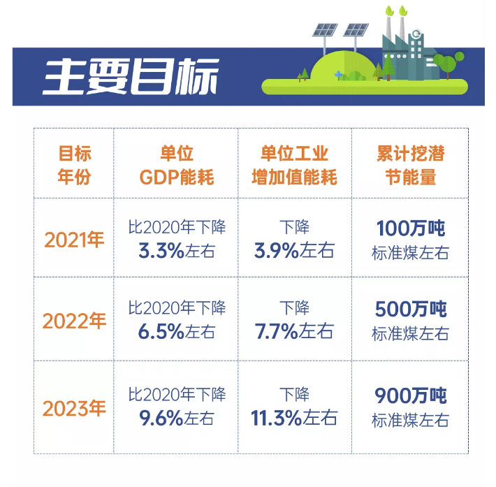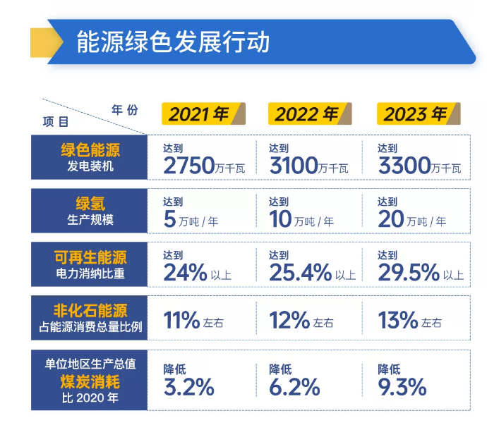 2023年,綠色能源發(fā)電裝機(jī)力爭(zhēng)達(dá)到3300萬(wàn)千瓦,綠氫生產(chǎn)規(guī)模達(dá)到20萬(wàn)噸/年??稍偕茉措娏ο{比重達(dá)到29.5%以上,非化石能源占能源消費(fèi)總量比例達(dá)到13%左 右。單位地區(qū)生產(chǎn)總值煤炭消耗比2020年降低9.3%。