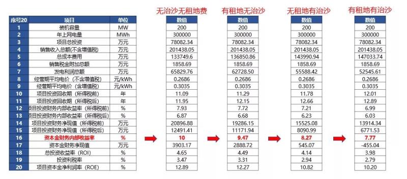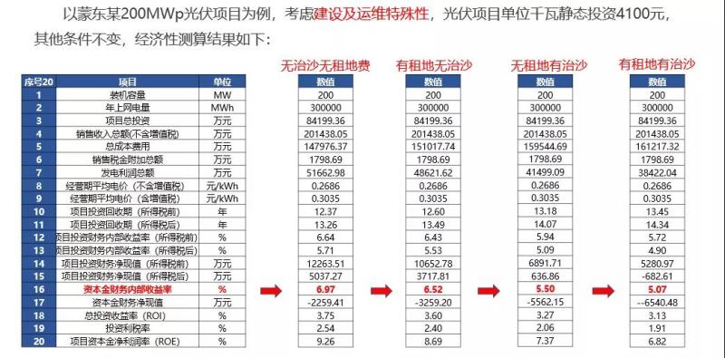 從經(jīng)濟(jì)性上來看,陳石亮以蒙東某200MWp光伏項目為例,在年均滿發(fā)小時數(shù)1500h,含稅上網(wǎng)電價0.3035元/kWh,光伏項目單位千瓦靜態(tài)投資3800元(備注:采用2021年上半年設(shè)備價格水平測算),項目占地約6000畝,土地租金200元/畝·年,治沙費(fèi)666元/畝·年。項目資本金內(nèi)部收益率會隨著租地、治沙等費(fèi)用逐步減少,其中有租地有治沙的項目內(nèi)部收益率最低為7.77%,基本可以滿足目前大部分國央企對于大基地項目的收益率要求。