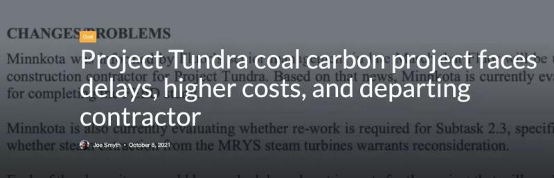 全球工程和建筑公司福陸公司(Fluor Corporation)正與明科塔電力合作社合作進(jìn)行前端工程和設(shè)計(FEED)研究,該研究主要由能源部資助。明科塔電力合作社在過去兩年向美國能源部(DOE)提交的季度報告顯示,Project Tundra成本高于預(yù)期,已經(jīng)錯過了最后開工的期限,主要承包商表示不會建造該項(xiàng)目。導(dǎo)致成本估算提高的原因包括修建16英里天然氣管道和為碳捕獲設(shè)施提供蒸汽的燃?xì)忮仩t的成本增加。