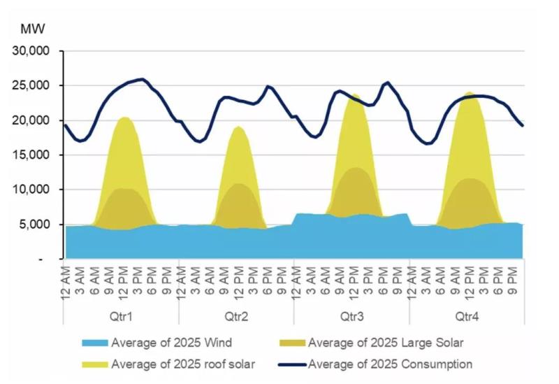 它表明,到 2025 年,風(fēng)能和太陽能的總產(chǎn)量有望在一年中的第 3 季度和第 4 季度的中午超過幾個小時的總電力需求。
