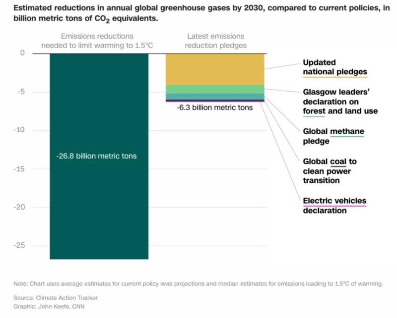 聯(lián)合國秘書長(zhǎng)安東尼奧·古特雷斯說,格拉斯哥協(xié)議“反映了當(dāng)今世界的利益、條件、矛盾和政治意愿...不幸的是,集體政治意愿不足以克服一些深刻的矛盾?!备鶕?jù)氣候行動(dòng)追蹤機(jī)構(gòu)的預(yù)測(cè),為了到2030年將全球變暖限制在1.5攝氏度,世界需要將溫室氣體排放率每年減少近270億公噸。但目前的承諾,包括在COP26會(huì)議上做出的承諾,只達(dá)到所需減排量的四分之一。