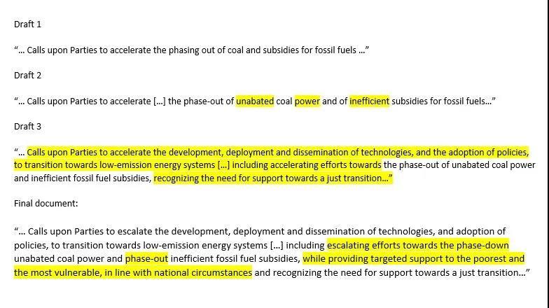 但是,格拉斯哥協(xié)議關(guān)于煤電的措辭在一周內(nèi)被多次淡化。在閉幕式全體會(huì)議前一小時(shí),部長(zhǎng)們?cè)谧詈笠环昼姲l(fā)生了激烈的爭(zhēng)論,由印度和中國共同提出的最終修改是對(duì)協(xié)議文本的唯一修改,得到了南非、玻利維亞和伊朗的支持。各國最終同意“逐步減少”(phase down)而不是“逐步淘汰”(phase out)沒有減排措施的煤電,并逐步取消低效的化石燃料補(bǔ)貼。