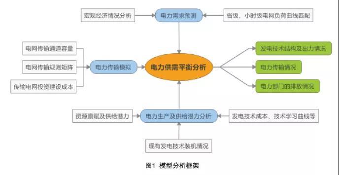 根據(jù)電力行業(yè)特點(diǎn),模型的分析框架包含電力需求模塊、電力生產(chǎn)模塊以及電力傳輸模塊三大部分(圖1)。電力需求模塊根據(jù)人口、產(chǎn)業(yè)、技術(shù)、城鎮(zhèn)化水平等宏觀經(jīng)濟(jì)分析數(shù)據(jù),結(jié)合省級(jí)電網(wǎng)負(fù)荷曲線展望未來省級(jí)區(qū)域分部門的用電需求結(jié)構(gòu)及趨勢(shì)。電力生產(chǎn)是模型分析的核心,以小時(shí)級(jí)的時(shí)間尺度為分析基礎(chǔ),詳細(xì)描述32個(gè)省級(jí)區(qū)域的18種發(fā)電技術(shù)組合,分析各省級(jí)區(qū)域的發(fā)電技術(shù)裝機(jī)結(jié)構(gòu)及發(fā)展趨勢(shì),各發(fā)電技術(shù)的出力及發(fā)電順序等。電力傳輸模塊主要關(guān)注未來區(qū)域間電力傳輸通道的投資建設(shè)成本,以及省級(jí)和大電網(wǎng)區(qū)域間的電力傳輸規(guī)則、傳輸通道容量等。核心分析在于省級(jí)區(qū)域電網(wǎng)傳輸規(guī)則矩陣構(gòu)建,輸出電力傳輸約束條件。
