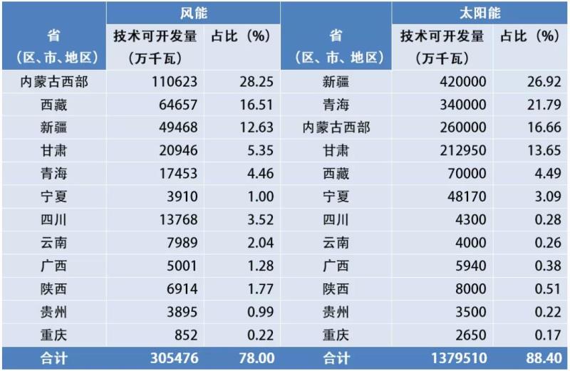 表2 西部地區(qū)12個(gè)?。▍^(qū)、市、地區(qū))風(fēng)能、太陽(yáng)能資源技術(shù)可開發(fā)量及占比情況