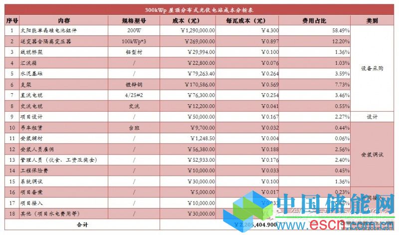 按照2013年年底西安地區(qū)某300kWp屋頂分布式光伏電站建設(shè)直接成本來分析,300kWp的項(xiàng)目總花費(fèi)為220萬多元(該費(fèi)用實(shí)際成本費(fèi)用,不含EPC單位項(xiàng)目建設(shè)利潤),其中組件占到58.49%,逆變器占到總成本的12.2%,支架占到總成本的7.73%。項(xiàng)目總造價(jià)每瓦成本約合7.3元。考慮系統(tǒng)集成公司利潤,對(duì)于常規(guī)屋頂電站項(xiàng)目市場(chǎng)報(bào)價(jià)按照8元每瓦較為合理。項(xiàng)目各項(xiàng)費(fèi)用支出及比例詳見上表及下圖所示。
