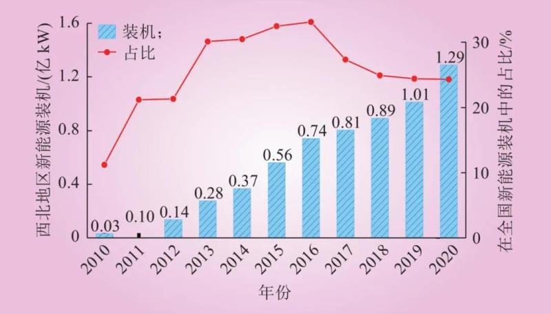 圖2 2010—2020年西北地區(qū)的新能源裝機情況