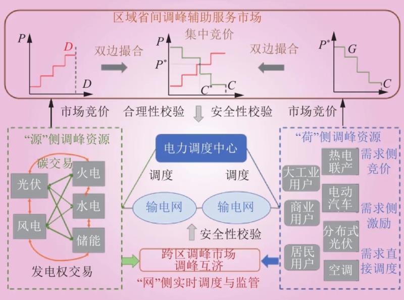 其中,“源”側(cè)主要交易品種包含發(fā)電權(quán)交易及碳交易,新能源機組與傳統(tǒng)機組可基于發(fā)電權(quán)及碳排放置換交易實現(xiàn)“源”側(cè)機組的調(diào)峰優(yōu)勢互補;“荷”側(cè)主要調(diào)峰參與模式包括需求側(cè)競價、需求側(cè)激勵以及需求側(cè)直接調(diào)度,可根據(jù)用戶側(cè)實際調(diào)控特性實現(xiàn)需求側(cè)調(diào)峰模式的優(yōu)選。為充分調(diào)動“源荷”雙方調(diào)峰積極性,可在區(qū)域調(diào)峰市場平臺引入靈活競價機制及多時間尺度交易品種,以雙邊撮合/集中競價的模式引導(dǎo)“源荷”聯(lián)動參與區(qū)域調(diào)峰市場,實現(xiàn)“源荷”靈活資源的一體化出清。此外,“網(wǎng)”側(cè)不僅可通過開展區(qū)域/省間調(diào)峰市場實現(xiàn)多區(qū)域的調(diào)峰互濟,且其作為實時調(diào)度與監(jiān)管機構(gòu)需對調(diào)峰市場出清結(jié)果進(jìn)行合理性校驗及安全性校驗,以保障電力調(diào)度及調(diào)峰市場的安全穩(wěn)定運行。