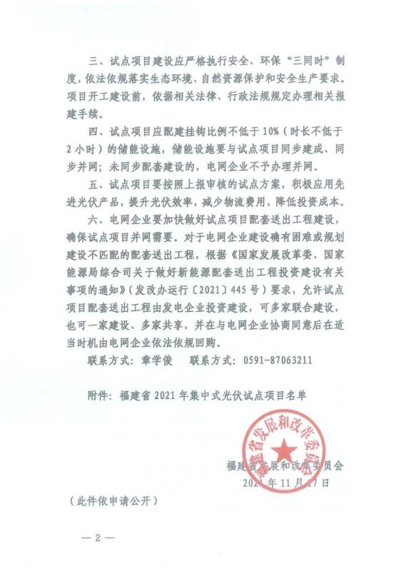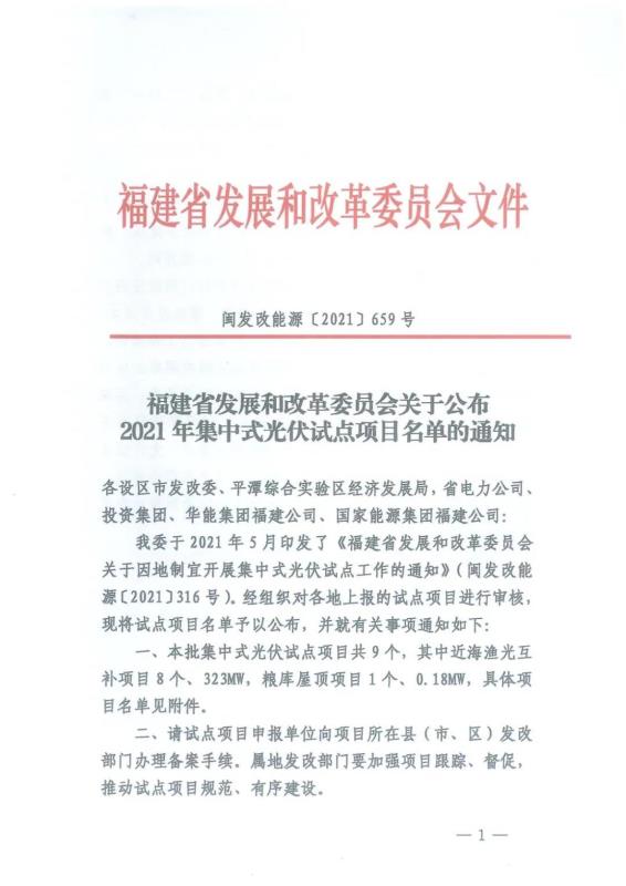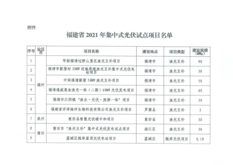 中國儲能網(wǎng)訊:11月17日,福建省發(fā)展和改革委員會公布了《2021年集中式光伏試點項目名單》的通知。本批集中式光伏試點項目共9個,其中近海漁光互補項目8個,規(guī)模323MW,糧庫屋頂項目1個,規(guī)模0.18MW。試點項目分別建設(shè)在福州、泉州、莆田三地。具體名單如下: