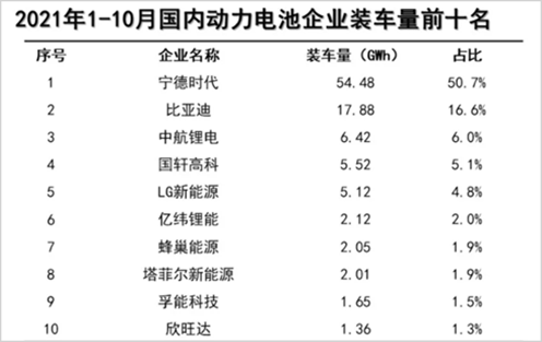 再來對(duì)比一下目前的裝機(jī)量水平和市占率,今年前十月,寧德時(shí)代的國內(nèi)裝機(jī)量占比超50%,是比亞迪的3倍以上,中航鋰電的8倍以上,是國軒高科的近10倍,是億緯鋰能的25倍。